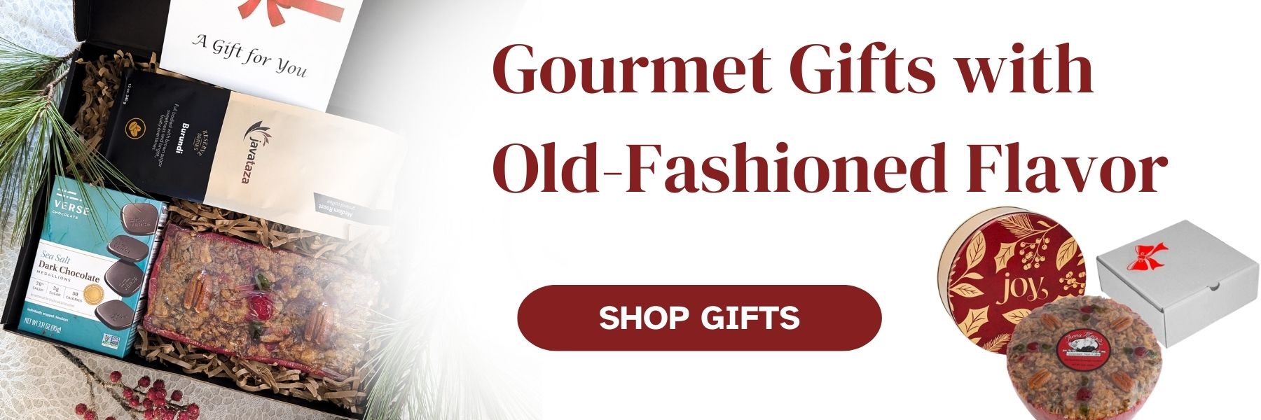 Give the gift of old-fashioned, homestyle goodness to your loved ones. Choose from our gourmet gift boxes featuring our Nut Cakes, or add on decorative holiday tins and gift boxes to your Nut Cake Order.